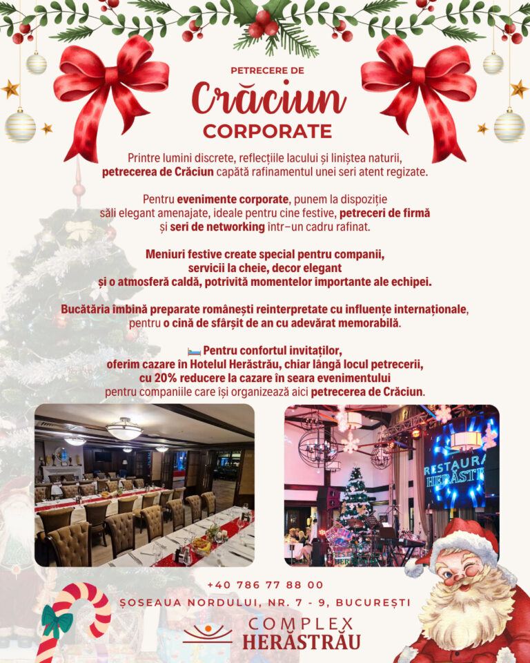 Pentru confortul oaspeților, Hotelul Herăstrău pune la dispoziție camere confortabile chiar lângă locul petrecerii, astfel încât seara să se poată prelungi în siguranță și relaxare, fără grija drumului de întoarcere. Iar pentru companiile care aleg să își organizeze petrecerea de Crăciun la Complex Herăstrău, oferim o reducere de 20% la cazare, în seara evenimentului.